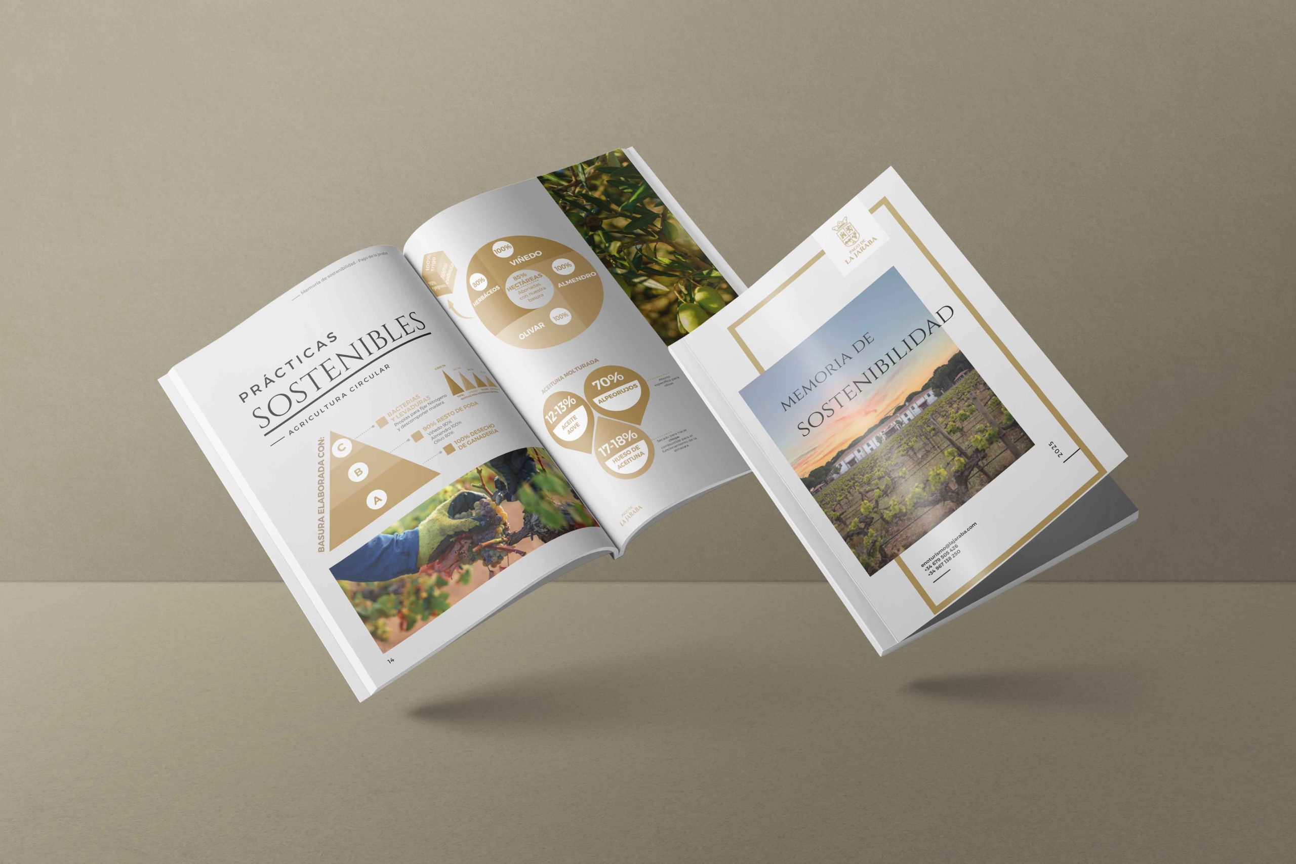 Nuestro trabajo no se quedó ahí. Creamos dossieres de producto y de agroturismo, diseñamos fichas de cata y desarrollamos un dossier de sostenibilidad que refleja su compromiso con el entorno. A esto se suman catálogos de producto, materiales corporativos y packaging, que refuerzan su posicionamiento y transmiten con claridad los valores de Pago de La Jaraba.